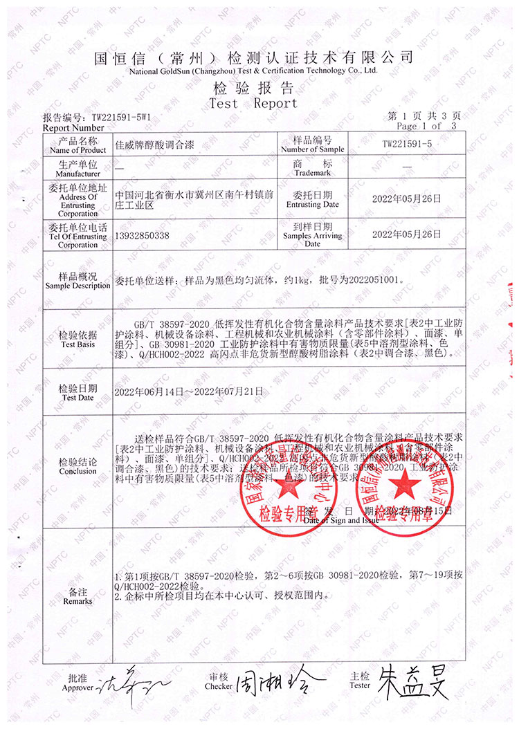 佳威醇酸調(diào)合漆檢驗(yàn)報告