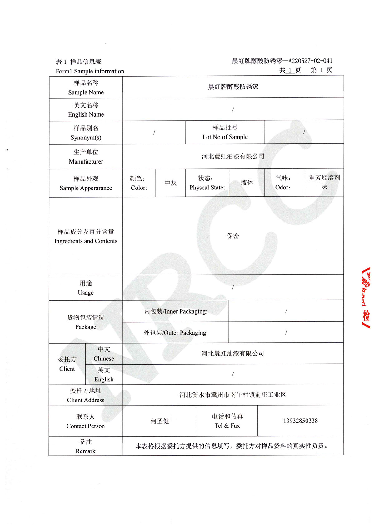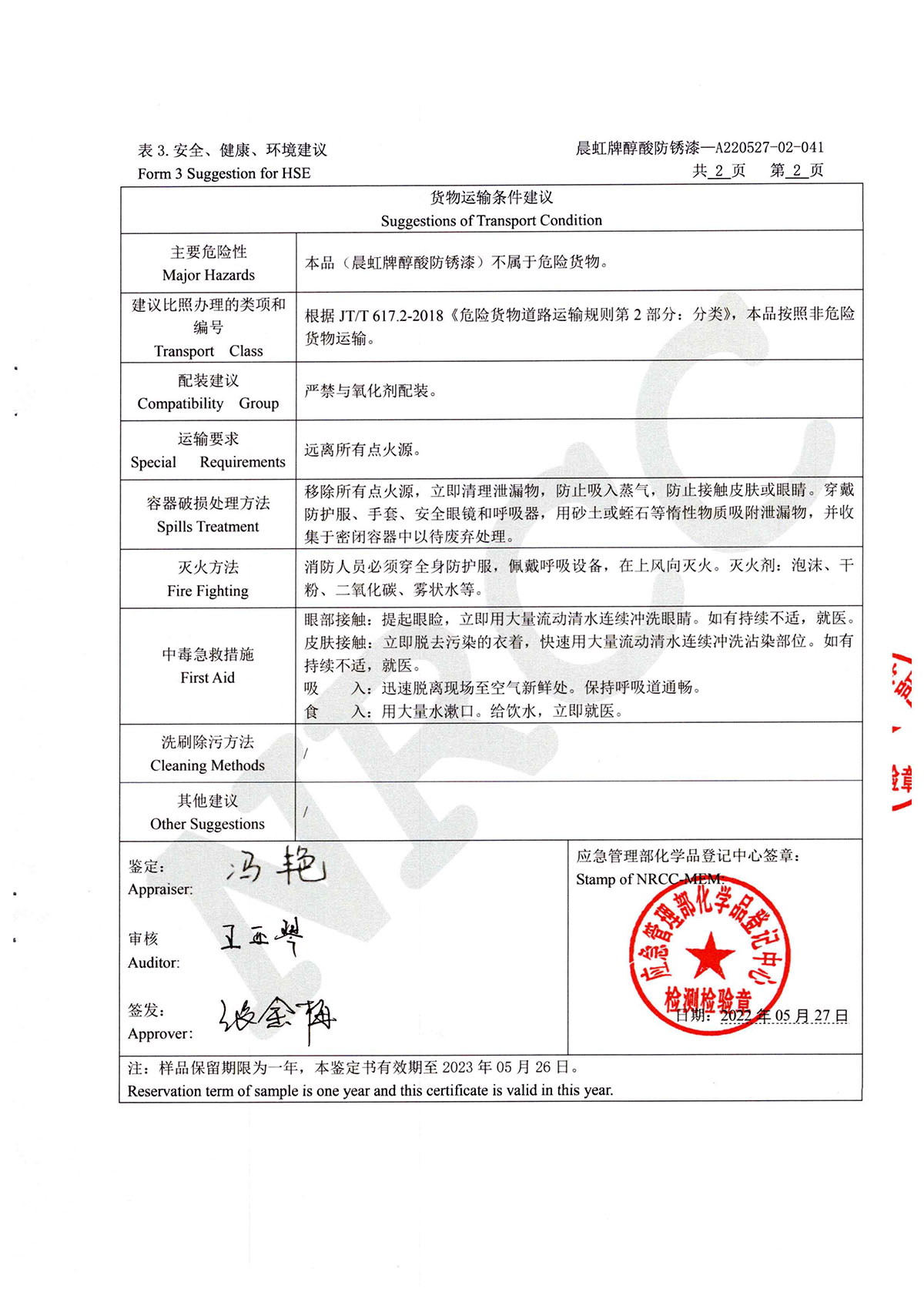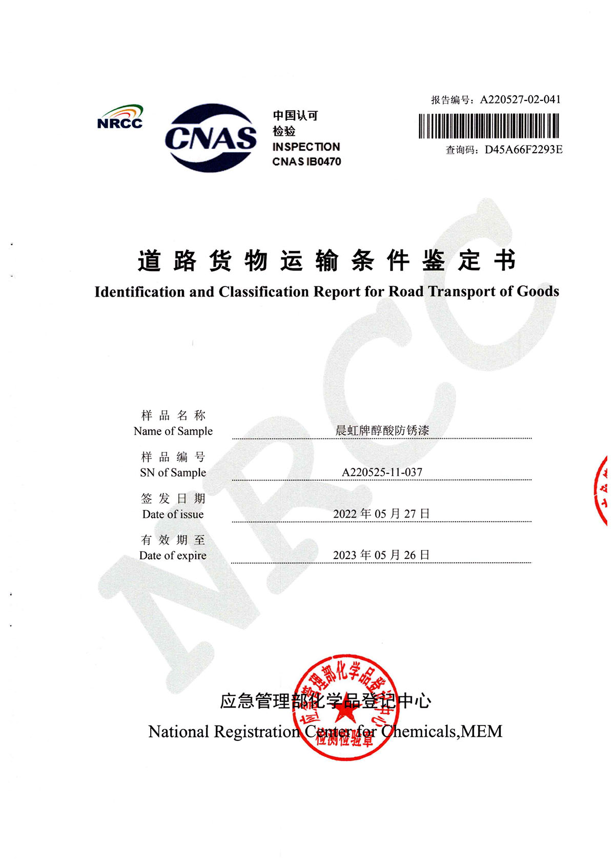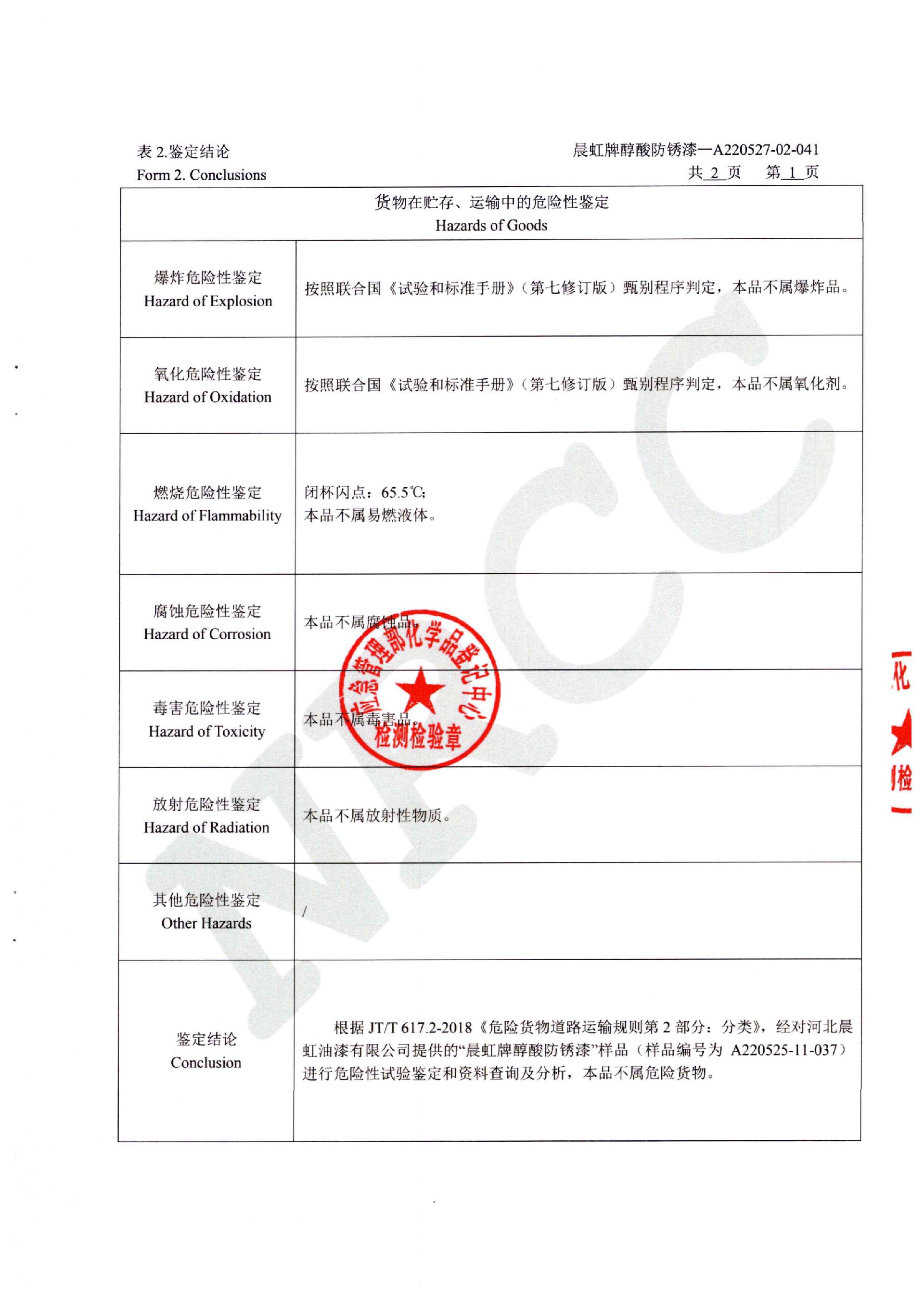 晨虹醇酸防銹漆道路貨物運輸鑒定書